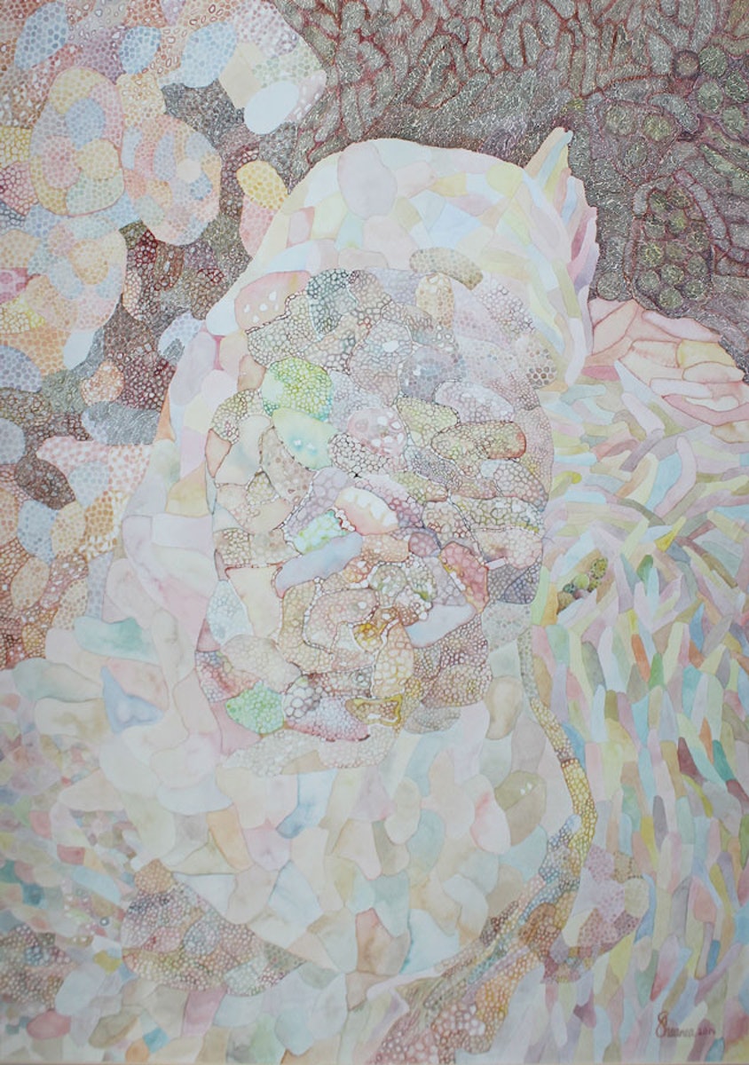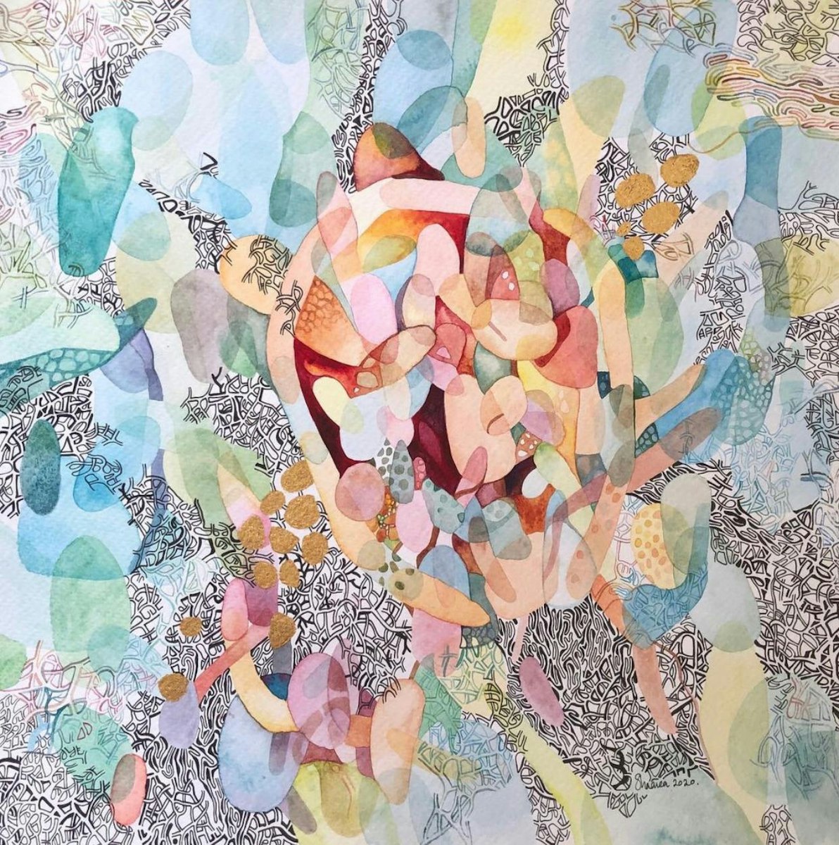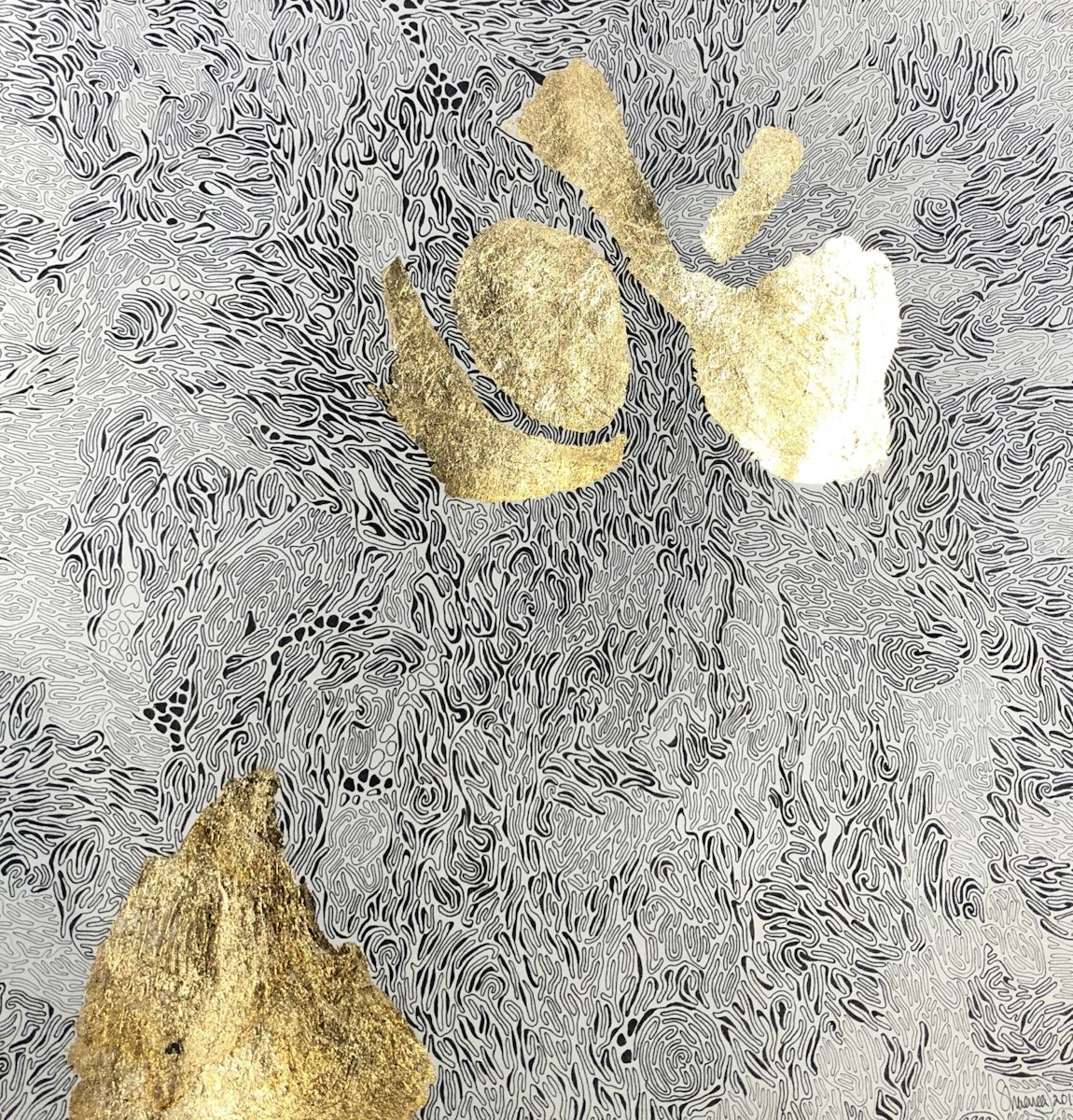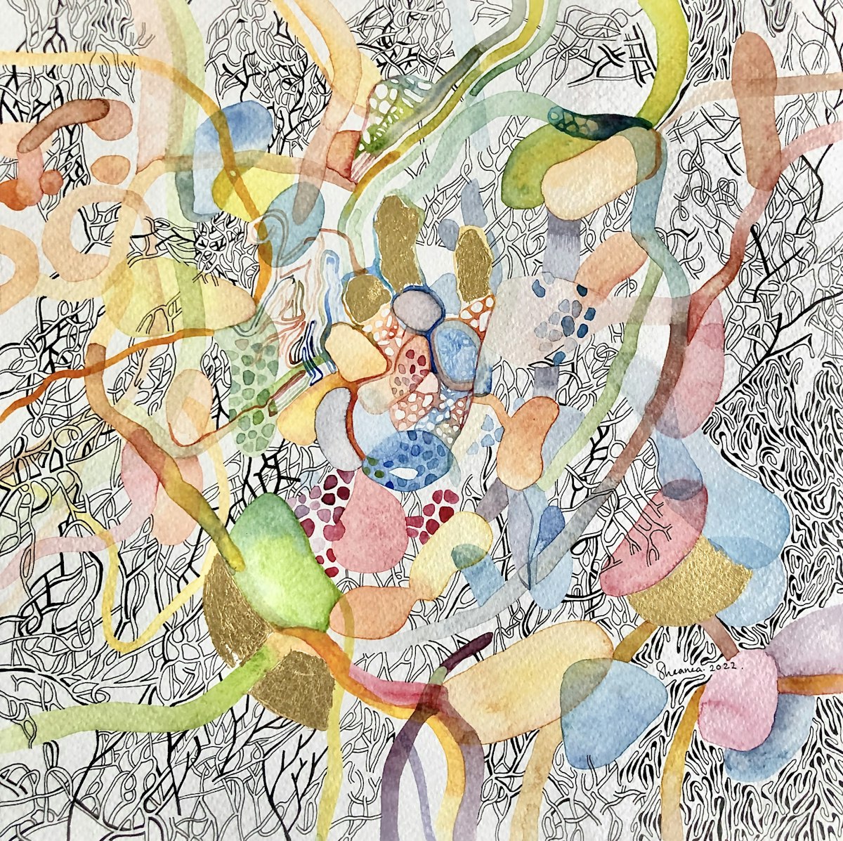 Her artistic practice revolves around a meditative process, drawing inspiration from intricate biological patterns and textures found in nature. These elements serve as both a meditative process and as metaphors to communicate subtle political and social commentary. Her artworks often feature oxidized iron/rust stains, gold leaf, verdigris, delicate pen and ink, and watercolour renderings.